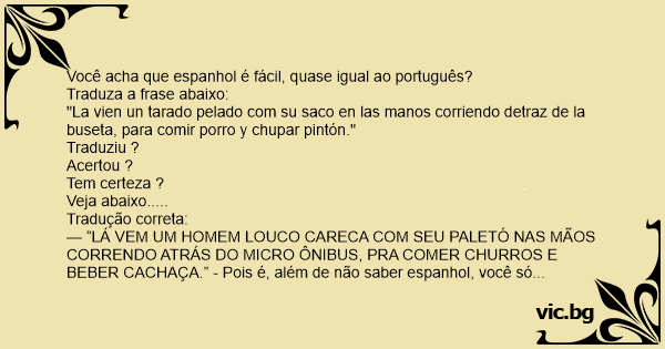 — ”LÁ VEM UM HOMEM LOUCO CARECA COM SEU PALETÓ NAS MÃOS CORRENDO ATRÁS DO MICRO ÔNIBUS, PRA COMER CHURROS E BEBER CACHAÇA.” - Pois é, além de não saber espanhol, você só pensa besteira...