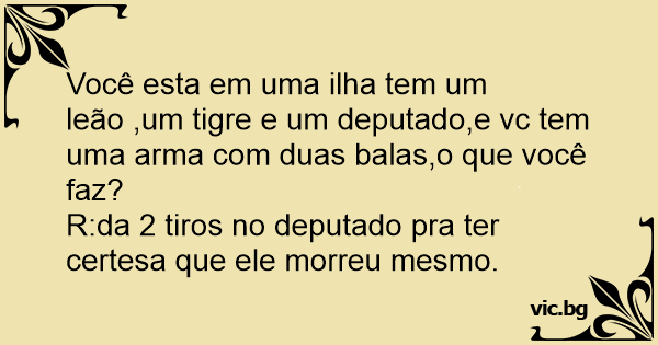 Você esta em uma ilha tem um leão ,um tigre e um deputado,e vc tem uma arma com duas balas,o que você faz?