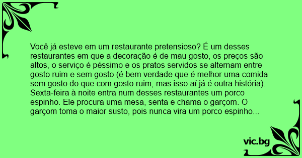 Sexta-feira à noite entra num desses restaurantes um роrсо espinho. Ele procura uma mesa, senta e chama o garçom. O garçom toma o maior susto, pois nunca vira um роrсо espinho falar. Mas fiса na dele, não comenta nada e atende o pedido do cliente. O роrсо espinho janta, mal disfarçando a insatisfação com a comida. Ao final, pede a conta e toma um susto: os preços são realmente muito altos. Paga e já vai saindo meio pê da vida quando o garçom diz a ele: