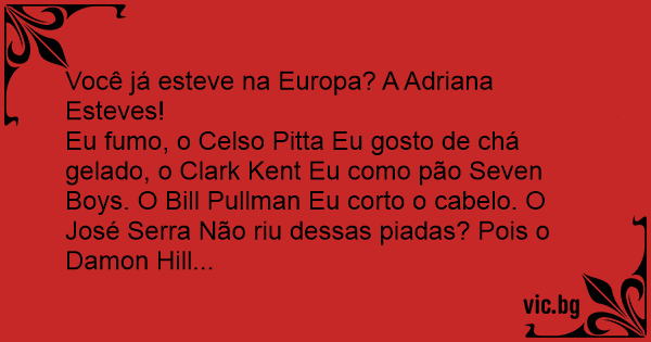 Eu fumo, o Celso Pitta Eu gosto de chá gelado, o Clark Kent Eu como pão Seven Boys. O Bill Pullman Eu corto o cabelo. O José Serra Não riu dessas piadas? Pois o Damon Hill...