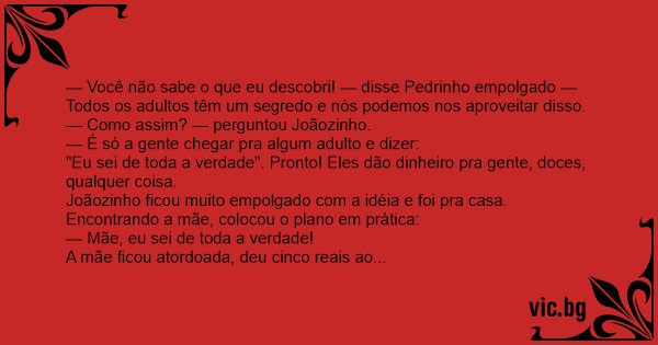 — Você não sabe o que eu descobri! — disse Pedrinho empolgado — Todos os adultos têm um segredo e nós podemos nos aproveitar disso.
