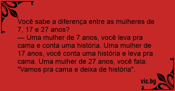 — Uma mulher de 7 anos, você leva pra cama e conta uma história. Uma mulher de 17 anos, você conta uma história e leva pra cama. Uma mulher de 27 anos, você fala: