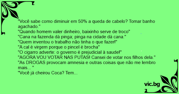 "Você sabe como diminuir em 50% a queda de cabelo? Tomar banho agachado."