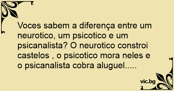 Voces sabem a diferença entre um neurotico, um psicotico e um psicanalista? O neurotico constroi castelos , o psicotico mora neles e o psicanalista cobra aluguel.....