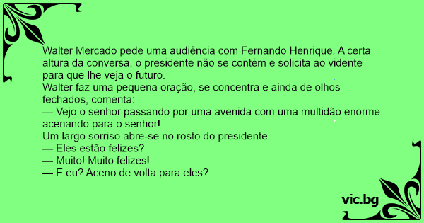 Walter Mercado pede uma audiência com Fernando Henrique. A certa altura da conversa, o presidente não se contém e solicita ao vidente para que lhe veja o futuro.