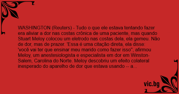 WASHINGTON (Reuters) - Tudo o que ele estava tentando fazer era aliviar a dor nas costas crônica de uma paciente, mas quando Stuart Meloy colocou um eletrodo nas costas dela, ela gemeu. Não de dor, mas de prazer. 'Essa é uma citação direta, ela disse: