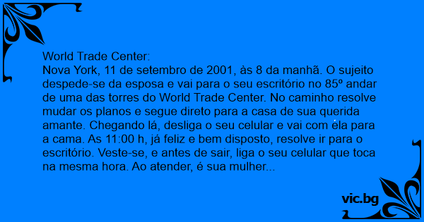 Nova York, 11 de setembro de 2001, às 8 da manhã. O sujeito despede-se da esposa e vai para o seu escritório no 85º andar de uma das torres do World Trade Center. No caminho resolve mudar os planos e segue direto para a casa de sua querida amante. Chegando lá, desliga o seu celular e vai com ela para a cama. As 11:00 h, já feliz e bem disposto, resolve ir para o escritório. Veste-se, e antes de sair, liga o seu celular que toca na mesma hоrа. Ao atender, é sua mulher gritando em pânico e aos prantos: