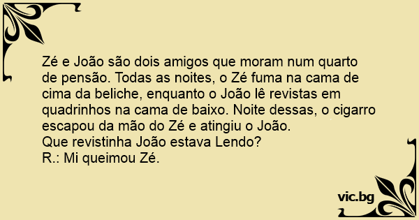 Zé e João são dois amigos que moram num quarto de pensão. Todas as noites, o Zé fuma na cama de cima da beliche, enquanto o João lê revistas em quadrinhos na cama de baixo. Noite dessas, o cigarro escapou da mão do Zé e atingiu o João.