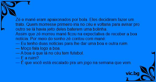 Zé e mané eram apaixonados por bola. Eles decidiram fazer um trato. Quem morresse primeiro iria no céu e voltaria para avisar pro outro se lá havia jeito deles baterem uma bolinha.