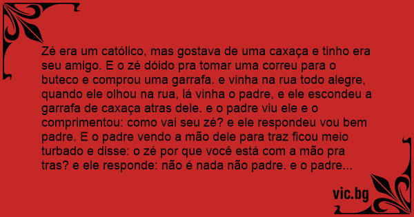 Zé era um católico, mas gostava de uma caxaça e tinho era seu amigo. E o zé dóido pra tomar uma correu para o buteco e comprou uma garrafa. e vinha na rua todo alegre, quando ele olhou na rua, lá vinha o padre, e ele escondeu a garrafa de caxaça atras dele. e o padre viu ele e o comprimentou: como vai seu zé? e ele respondeu vou bem padre. E o padre vendo a mão dele para traz ficou meio turbado e disse: o zé por que você está com a mão pra tras? e ele responde: não é nada não padre. e o padre ensiste mostra a mão zé. e ele diz não tem nada aqui não. e o padre dis novamente mostra a mão zé. e ele mostrou. e o padre disse: que vergonha zé com uma garrafa de caxaça zé joga essa garrafa fora zé. e ele diz: não posso. e o padre insiste joga fora zé. e zé continua dizendo:não posso. - mas por que não pode zé?por que eminha e do toinho. - mas joga sua parte fora. - não posso. - por que? por que minha parte é a de baixo e se eu virar a garrafa vai cair a do toinho.