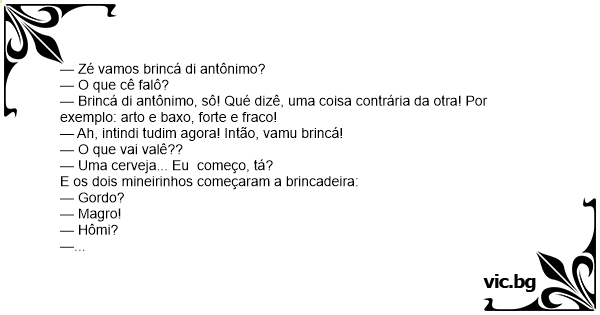 — Brincá di antônimo, sô! Qué dizê, uma coisa contrária da otra! Por exemplo: arto e baxo, forte e fraco!
