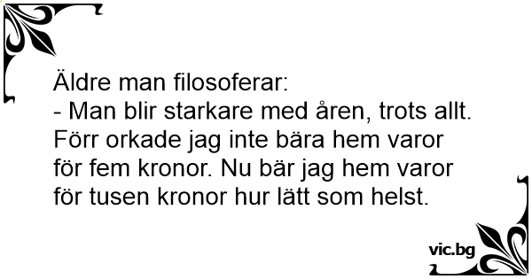 - Man blir starkare med åren, trots allt. Förr orkade jag inte bära hem varor för fem kronor. Nu bär jag hem varor för tusen kronor hur lätt som helst.