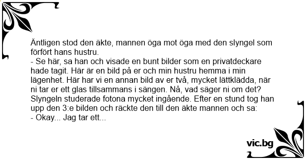 - Se här, sa han och visade en bunt bilder som en privatdeckare hade tagit. Här är en bild på er och min hustru hemma i min lägenhet. Här har vi en annan bild av er två, mycket lättklädda, när ni tar er ett glas tillsammans i sängen. Nå, vad säger ni om det?