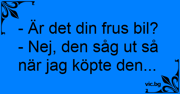 - Är det din frus bil?<br />- Nej, den såg ut så när jag köpte den...
