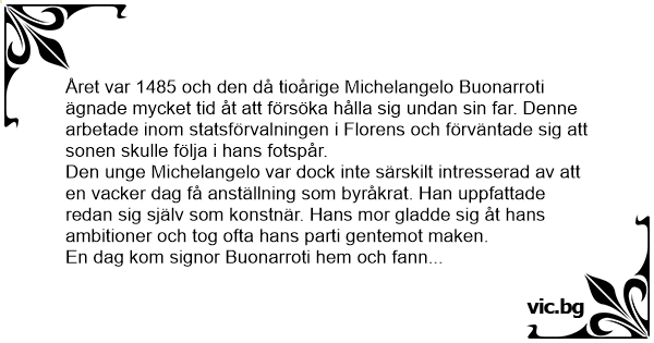 Året var 1485 och den då tioårige Michelangelo Buonarroti ägnade mycket tid åt att försöka hålla sig undan sin far. Denne arbetade inom statsförvalningen i Florens och förväntade sig att sonen skulle följa i hans fotspår.
