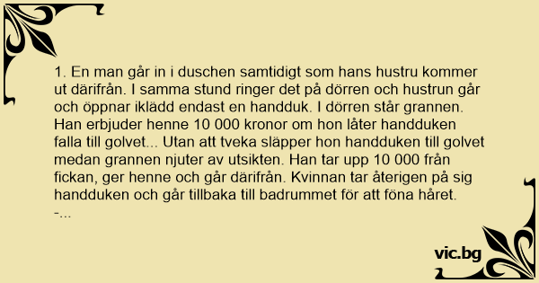 1. En man går in i duschen samtidigt som hans hustru kommer ut därifrån. I samma stund ringer det på dörren och hustrun går och öppnar iklädd endast en handduk. I dörren står grannen. Han erbjuder henne 10 000 kronor om hon låter handduken falla till golvet... Utan att tveka släpper hon handduken till golvet medan grannen njuter av utsikten. Han tar upp 10 000 från fickan, ger henne och går därifrån. Kvinnan tar återigen på sig handduken och går tillbaka till badrummet för att föna håret.