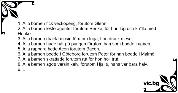 9. Alla barnen simmade i bassängen förutom Lotten, för det var hon som låg på botten.