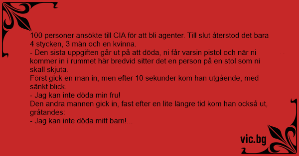 CIA-agenten CIA søgte ny topagent. Tilbage af en masse ansøgere var tre personer tilbage, to mænd og en kvinde. Så siger de til den første mand: “Derinde sidder din kone, gå ind og skyd hende.” Han...