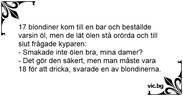 Det var en gång 17 blondiner som stod utanför en klubb. Efter ett tag frågade vakten: - Varför går ni inte in ?? Blondinerna: - Man måste va 18...!