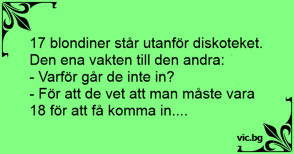 Det var en gång 17 blondiner som stod utanför en klubb. Efter ett tag frågade vakten: - Varför går ni inte in ?? Blondinerna: - Man måste va 18...!