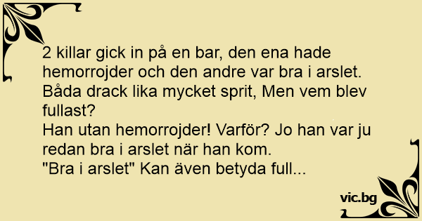 2 killar gick in på en bar, den ena hade hemorrojder och den andre var вrа i arslet. Båda drack lika mycket sprit, Men vem blev fullast?