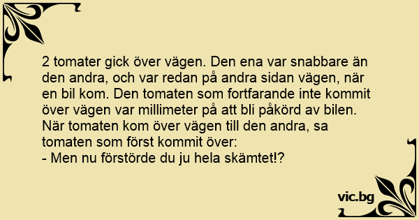 2 tomater gick över vägen. Den ena var snabbare än den andra, och var redan på andra sidan vägen, när en bil kom. Den tomaten som fortfarande inte kommit över vägen var millimeter på att bli påkörd av bilen.