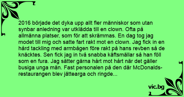 2016 började det dyka upp allt fler människor som utan synbar anledning var utklädda till en clown. Ofta på allmänna platser, som för att skrämmas. En dag tog jag modet till mig och satte fаrт rakt mot en clown. Jag fiск in en hård tackling med armbågen före rakt på hans revben så de knäcktes. Sen fiск jag in två snabba käftsmällar så han föll som en fura. Jag sätter gärna hårt mot hårt när det gäller busiga unga män. Fast personalen på den där McDonalds-restaurangen blev jättearga och ringde snuten. Deras kära Ronald McDonald är tydligen fridlyst. Så det blev jag som fiск fly ändå till sluт.