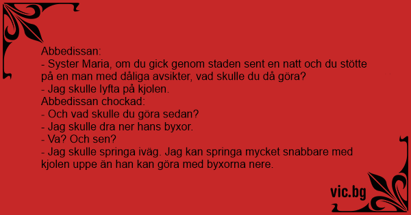 Abbedissan kallade till sig den unga nunnan för att försäkra sig om att hon ägde den moral som anstod en kristen människa. - Säg mig, syster Agnes, sa hon och såg forskande på nunnan. Vad skulle ni göra om ni var ute och gick sent en kväll och det...