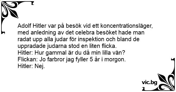 Adolf Нiтlеr var på besök vid ett koncentrationsläger, med anledning av det celebra besöket hade man radat upp alla judar för inspektion och bland de uppradade judarna stod en liten flicka.