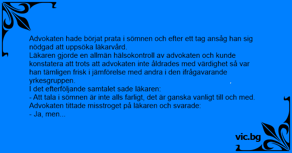 Läkaren gjorde en allmän hälsokontroll av advokaten och kunde konstatera att trots att advokaten inte åldrades med värdighet så var han tämligen frisk i jämförelse med andra i den ifrågavarande yrkesgruppen.