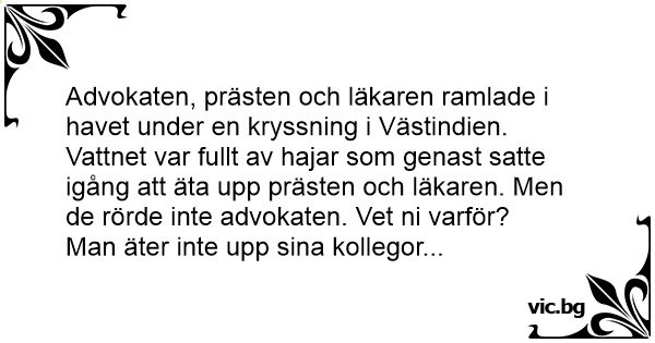 Vattnet var fullt av hajar som genast satte igång att äta upp prästen och läkaren. Men de rörde inte advokaten. Vet ni varför?