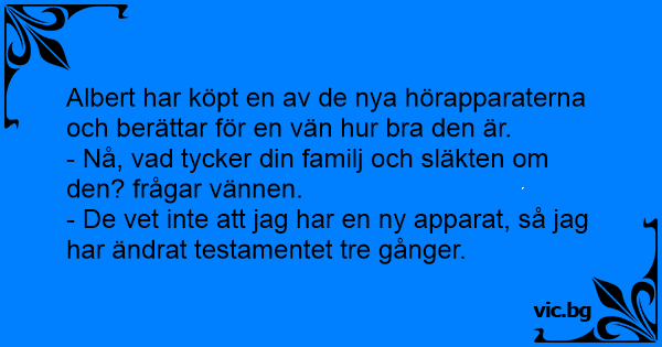 – Nå, Nils, hvordan trives du med det nye høreapparatet? – Det er helt fabelaktig. – Jeg har alt skrevet om testamentet mitt tre ganger.