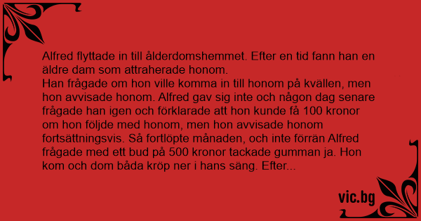 Han frågade om hon ville komma in till honom på kvällen, men hon avvisade honom. Alfred gav sig inte och någon dag senare frågade han igen och förklarade att hon kunde få 100 kronor om hon följde med honom, men hon avvisade honom fortsättningsvis. Så fortlöpte månaden, och inte förrän Alfred frågade med ett bud på 500 kronor tackade gumman ja. Hon kom och dom båda kröp ner i hans säng. Efter fullbordat verk utbrast Alfred: