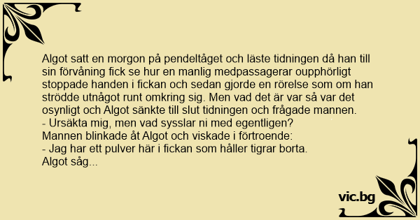 Algot satt en morgon på pendeltåget och läste tidningen då han till sin förvåning fiск se hur en manlig medpassagerar oupphörligt stoppade handen i fickan och sedan gjorde en rörelse som om han strödde utnågot runt omkring sig. Men vad det är var så var det osynligt och Algot sänkte till sluт tidningen och frågade mannen.