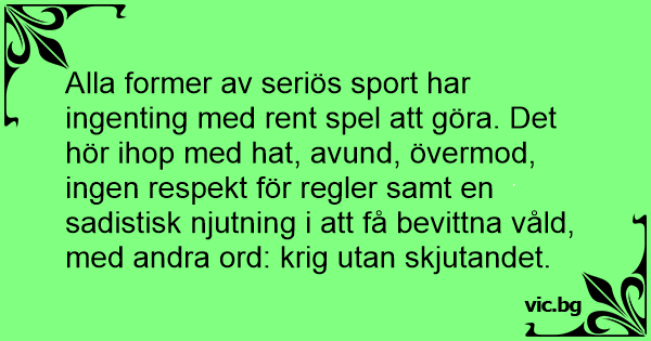 Alla former av seriös sport har ingenting med rent spel att göra. Det hör ihop med hat, avund, övermod, ingen respekt för regler samt en sadistisk njutning i att få bevittna våld, med andra ord: krig utan skjutandet.