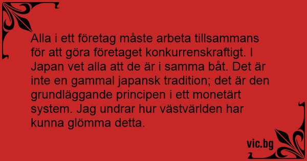 Alla i ett företag måste arbeta tillsammans för att göra företaget konkurrenskraftigt. I Japan vet alla att de är i samma båt. Det är inte en gammal japansk tradition; det är den grundläggande principen i ett monetärt system. Jag undrar hur västvärlden har kunna glömma detta.