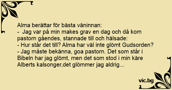 - Jag måste bekänna, goa pastorn. Det som står i Bibeln har jag glömt, men det som stod i min käre Alberts kalsonger,det glömmer jag aldrig...