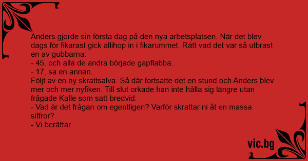 Anders gjorde sin första dag på den nya arbetsplatsen. När det blev dags för fikarast gick allihop in i fikarummet. Rätt vad det var så utbrast en av gubbarna: