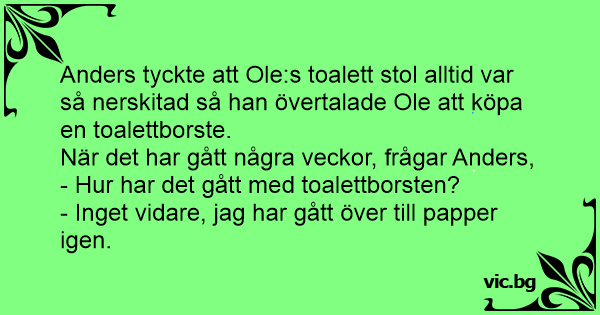 - Jag hörde att du köpte en toalettborste igår. - Ja det gjorde jag. - Vad tyckte du om den? - Nja jag tycker nog att papper är bättre...