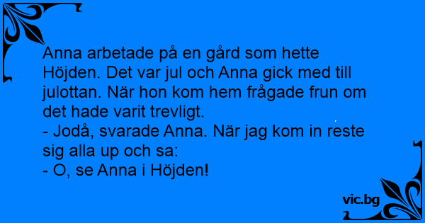Anna arbetade på en gård som hette Höjden. Det var jul och Anna gick med till julottan. När hon kom hem frågade frun om det hade varit trevligt.