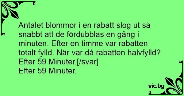 Antalet blommor i en rabatt slog ut så snabbt att de fördubblas en gång i minuten. Efter en timme var rabatten totalt fylld. När var då rabatten halvfylld?