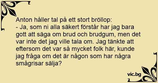 - Ja, som ni alla säkert förstår har jag bara gott att säga om brud och brudgum, men det var inte det jag ville tala om. Jag tänkte att eftersom det var så mycket folk här, kunde jag fråga om det är någon som har några smågrisar sälja?