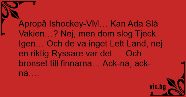 Apropå Ishockey-VM… Kan Ada Slå Vakien…? Nej, men dom slog Tjeck Igen… Och de va inget Lett Land, nej en riktig Ryssare var det…. Och bronset till finnarna… Ack-nä, ack-nä….
