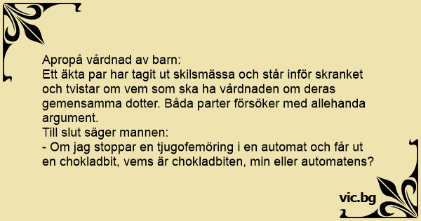 Автомат Der Sorgerechtsstreit Man en vrouw zijn in een echtscheidingsprocedure verwikkeld en staan voor de rechter. De kinderen komen ter sprake en de vrouw vindt dat zij recht heeft op de kinderen, omdat zij ze gebaard heeft.... Skilsmässoparet vill båda ha vårdnaden om deras enda barn. Domaren anser att modern har största rätten till barnet men mannen bestrider detta med följande motivering: - Om domaren lägger en krona... Trwa rozprawa rozwodowa, a dokładniej - sprawa o przyznanie opieki nad dzieckiem. Matka (jeszcze żona, już nie kochanka) wstała i jasno dała do zrozumienia sędziemu, że dzieci należą się jej. To... Egy kis faluban élő házaspár válni készül. Mindketten maguknak akarják a gyerekeket. A válóperes tárgyaláson a bíró mindkét felet megkérdezi, mielőtt a gyerekekről dönt. Az asszony azzal indokolja... Der var stor ståhej i det lille hjem. Ægteparet skulle skilles, og parret diskuterede vildt og inderligt , hvem der skulle have forældreretten over parrets barn. - Hør her! råbte konen vredt. - Jeg... Válóperes tárgyaláson veszekszik a férj és a feleség, hogy kinél maradjon a gyerek. Elsőnek a feleség kapja meg a szót : - Én szültem, tehát az enyém. Mire a férj a bíróhoz fordul. - Tisztelt bíró... A man and a woman went to court disputing over custody of their child. The Judge asked the woman to rise and argue her case. “I went through all the pain undergoing labour and I see no reason why... Маж и жена се разведуваат на суд и пред судијата се расправаат за старателството над детето. Жената му вели на судијата: - Јас го родив детето, во мојот стомак растеше и треба мене да ми припадни.... Um casal está se separando e está discutindo com o juiz a custódia da criança. A mãe argumenta que ela é que tem que ficar com a criança, por todos os motivos que as mulheres alegam nesses casos: —...