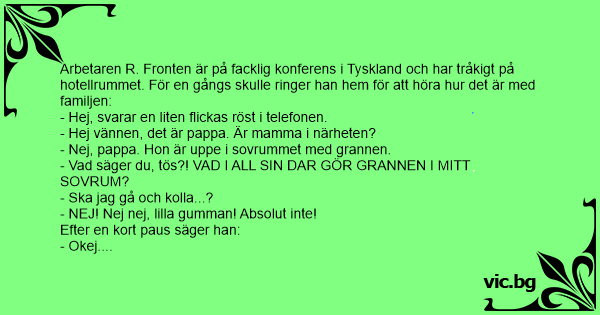 - Ало? - Здравей, миличко, обажда се татко. Мама близо до телефона ли е? - Не, тате. Тя е горе в спалнята с чичо Гошо. След кратка пауза таткото казва: - Но ти нямаш чичо с име Гошо, миличко! - О, да, имам и той е горе в спалнята с мама в момента! - Ъ, добре тогава... ето какво искам да направиш....