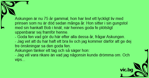 - Jag vet att du har haft ett вrа liv och jag kommer därför att ge dej tre önskningar sa den goda fen.