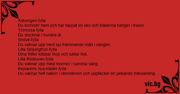 Askungen-fylla Du kommer hem och har tappat en sko och kläderna hänger i trasor. Törnrosa-fylla Du slocknar i hundra år. Snövit-fylla Du vaknar upp med sju främmande män i sängen. Lilla Sjöjungfrun-fylla Dina fötter klibbar ihop och luktar fisk. Lilla Rödluvan-fylla Du vaknar upp med mormor i samma säng. Kejsarens nya kläder-fylla: Du vaknar helt naken i rännstenen och upptäcker en pekande folksamling. Fula Ankungen-fylla: Du vaknar upp med en äkta hälft - men det är inte din. Den här är snyggare. Nalle Puh-fylla: Din buk har svällt till dubbel storlek och din mun är kladdig. Stålmannen-fylla: Din kropp är både röd och blå, och folks viskningar låter som höga skrik. Joakim von Anka-fylla: Du vaknar och har en stor hög med pengar men inga byxor. Musse Pigg-fylla: Dina öron är svullna och du har dina vita handskar, men av fracken syns inte ett spår. Hans och Greta-fylla: Du kan lätt hitta till toaletten genom att följa spåret av nattens uppkastningar. Pippi Långstrump-fylla: Du vaknar mellan en häst och en apa och finner väskan full med pengar. Stora Stygga Vargen-fylla: Du har så taskig andedräkt att du kan blåsa omkull ett hus. Bambi-fylla: Dina ben vägrar lyda dig och ditt huvud känns stort som en badboll. Attila-fylla: Du lämnar kaos och förödelse där du drar fram. Hitler-fylla: Du slocknar i en bunker. Christoffer Columbus-fylla: Du vet inte vart du är på väg, inte var du är när du kommer fram, men hela kalaset bekostas av staten. Tarzan-fylla: Du vaknar halvnaken i skogen och undrar varför du är så hes. Y2K-fylla: Din hjärna fungerar inte och din tankeverksamhet är totalnollad så du börjar om från igår. Microsoft-fylla: De flesta av dina kroppsfunktioner krånglar och du vet att du inte hinner fixa till dig innan svärmor kommer, men du vägrar erkänna att det är ett problem.