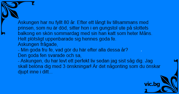- Askungen, du har levt ett perfekt liv sedan jag sist såg dig. Jag skall belöna dig med 3 önskningar! Är det någonting som du önskar djupt inne i ditt hjärta?