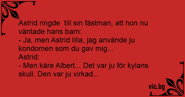 Astrid ringde till sin fästman, att hon nu väntade hans barn: - Ja, men Astrid lilla, jag använde ju kondomen som du gav mig... Astrid: - Men käre Albert... Det var ju för kylans skull. Den var ju virkad...