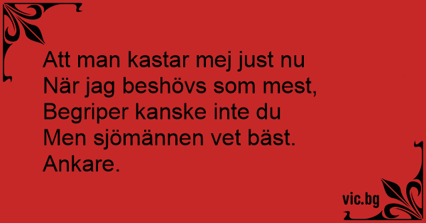 Att man kastar mej just nu När jag beshövs som mest, Begriper kanske inte du Men sjömännen vet bäst. Ankare.